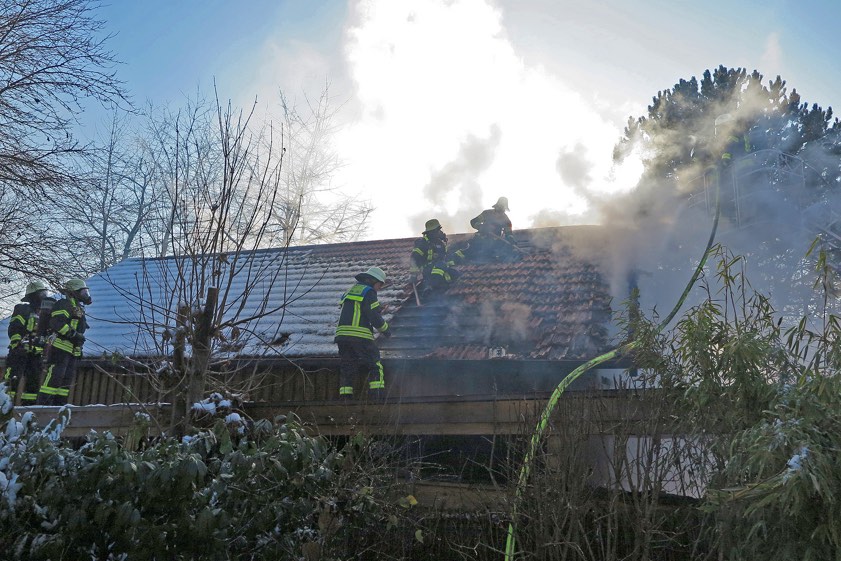 Laut Schilderung der Feuerwehr stand zunächst ein Unterstand in Flammen. "In der dichten Bebauung griffen die Flammen rasch über und der Brand breitete sich auf ein rund zwölf auf sieben Meter großes Nebengebäude aus, das unter anderem als Garage diente", heißt es im Einsatz-Bericht der Floriansjünger. "Mit zwei Strahlrohren im Außenangriff und einem Angriffstrupp im Inneren des Gebäudes konnten die Flammen zwar rasch eingedämmt werden, allerdings glimmte es weiter unter der holzverkleideten Fassade und im Dachstuhl." In aufwändiger Handarbeit deckten die Helfer deshalb Teile des Daches ab und entfernten die Holzfassade an der Giebelseite, um alle Glutnester erreichen zu können.