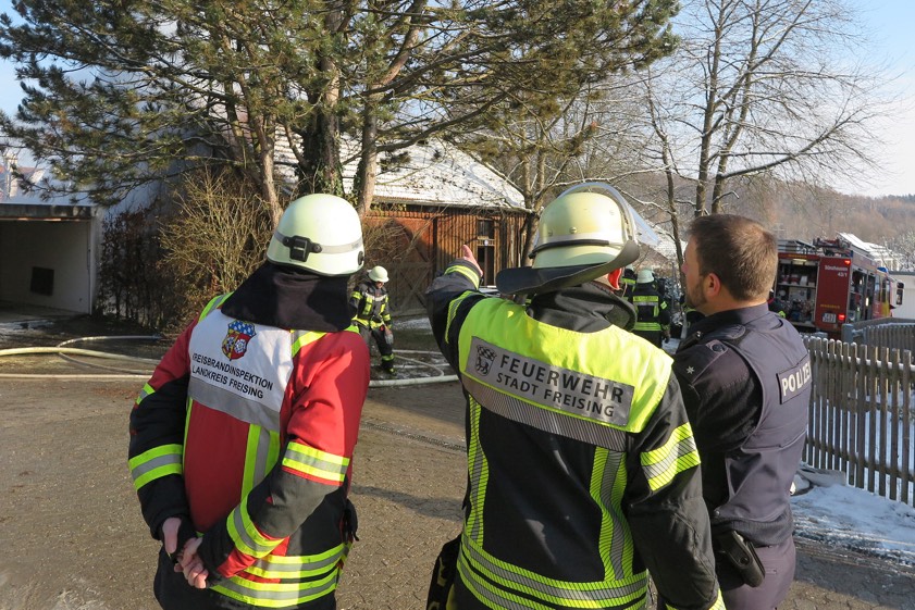 (ty) "Ein Schuppen brennt lichterloh!" So hat nach Angaben der Polizei am heutigen Vormittag der Notruf gelautet, der kurz nach 11 Uhr bei der Integrierten Leitstelle eingegangen ist. Zahlreiche Feuerwehrleute rückten daraufhin im Freisinger Ortsteil Sünzhausen an und begannen am Pfarrweg sogleich mit der Bekämpfung der Flammen. "Das Feuer in einem Anbau griff auf die Fassade und den Dachstuhl eines Nebengebäudes über", fasst die Freisinger Feuerwehr zusammen. Und: "Ein Totalverlust konnte durch die Einsatzkräfte verhindert werden." Aus einer anliegenden Garage konnten laut Polizei noch zwei Fahrzeuge entfernt werden.