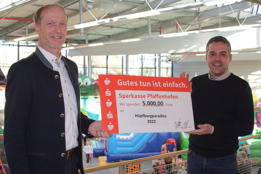 Zur Eröffnung des diesjährigen Hüpfburg-Paradieses überreichte Tino Müller, der Vorstands-Vorsitzende der Pfaffenhofener Sparkasse, einen symbolischen Spenden-Scheck über 5000 Euro an Bürgermeister Thomas Herker (SPD). Das Stadtoberhaupt bedankte sich bei dem Geldinstitut für die großzügige finanzielle Unterstützung sowie beim Hüpfburgen-Verleiher Norbert Kurzmeier für die fantasievollen Spielelemente. "Rund 20 verschiedene Spielmöglichkeiten stehen den Mädchen und Jungen zum Ausprobieren und Austoben zur Verfügung", heißt es in einer Mitteilung aus dem Rathaus.