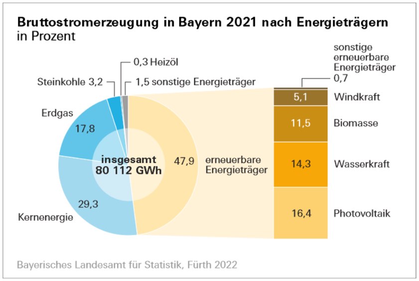 Der Rückgang der Stromerzeugung aus erneuerbaren Energien erklärt sich laut Landesamt für Statistik hauptsächlich durch eine geringere Stromerzeugung aus Windenergie von 4074 GWh (minus 16,5 Prozent) und aus Biomasse von 9225 GWh (minus 1,9 Prozent). Der Erzeugungs-Rückgang bei diesen beiden Energieträgern in Höhe von insgesamt 978 GWh konnte durch die steigende Stromerzeugung aus Wasserkraft (plus 291 GWh), Photovoltaik (plus 198 GWh) und sonstigen erneuerbaren Energien (plus 30 GWh) nicht kompensiert werden. Folglich sank der Anteil erneuerbarer Energien am bayerischen Stromerzeugungs-Mix von 51,9 Prozent im Vorjahr auf 47,9 Prozent.