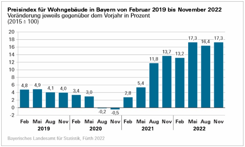 (ty) Der Preisindex für den Neubau von Wohngebäuden im Freistaat hat im November einen Stand von 154,6 (2015≙100) erreicht. "Dies entspricht einer durchschnittlichen Preissteigerung von 17,3 Prozent im Vergleich zum Vorjahres-Monat", fast das bayerische Landesamt für Statistik zusammen (siehe auch Grafik unten).