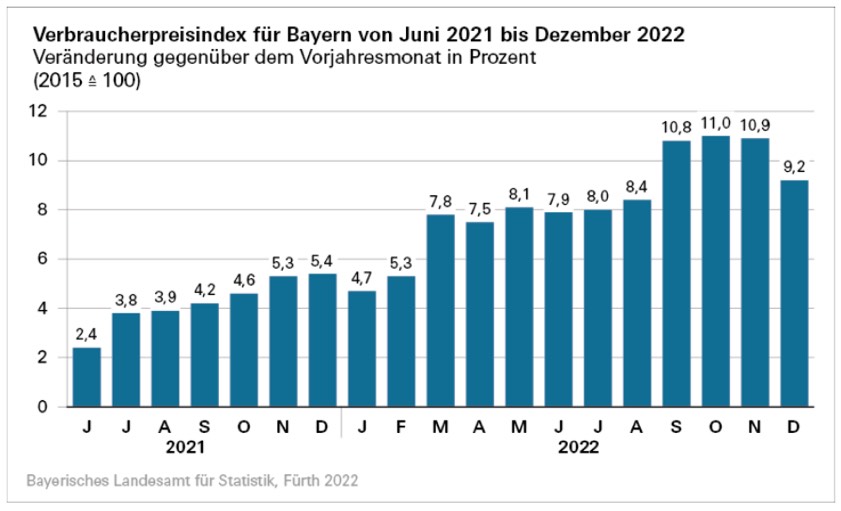 Die Inflationsrate, gemessen als prozentuale Veränderung des Verbraucherpreis-Index für Bayern gegenüber dem entsprechenden Vorjahres-Monat, lag im Dezember 2022 bei 9,2 Prozent. Der Gesamtindex ohne die aktuellen Haupt-Preistreiber Nahrungsmittel und Energie, in der öffentlichen Diskussion oft als Kerninflationsrate bezeichnet, belief sich im Dezember auf 5,5 Prozent. Gegenüber dem Vormonat sei der Verbraucher-Preisindex im Dezember um 1,1 Prozent gefallen.