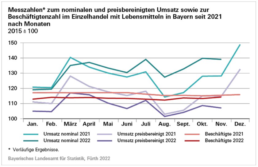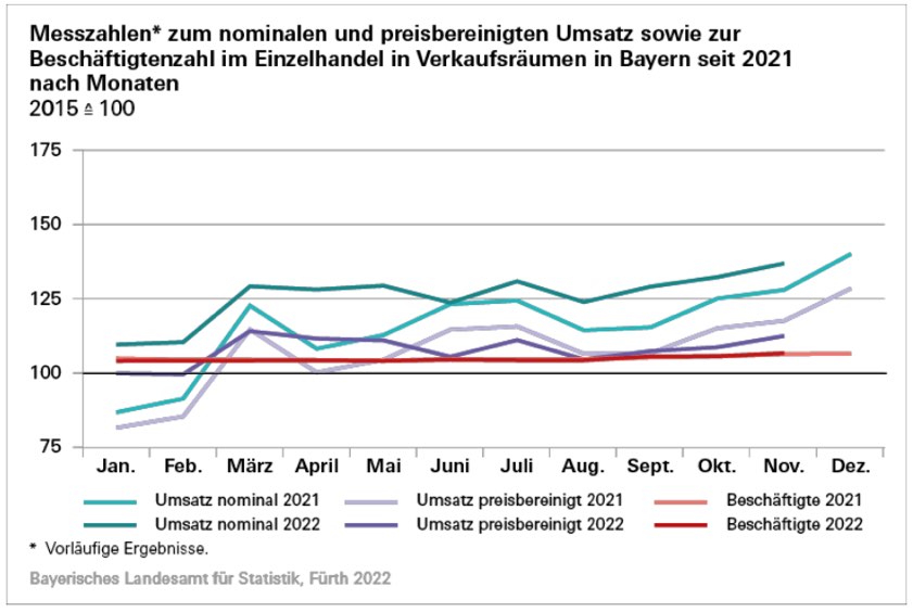 Im Vergleich zum Vormonat, also zum Oktober 2022, stieg der nominale Umsatz des Einzelhandels in Bayern im November 2022 um 12,7 Prozent. Davon nahm der Umsatz des "Einzelhandels mit Lebensmitteln" um 0,5 Prozent ab, während der Umsatz des "Einzelhandels mit Nicht-Lebensmitteln" um 18,3 Prozent stieg.