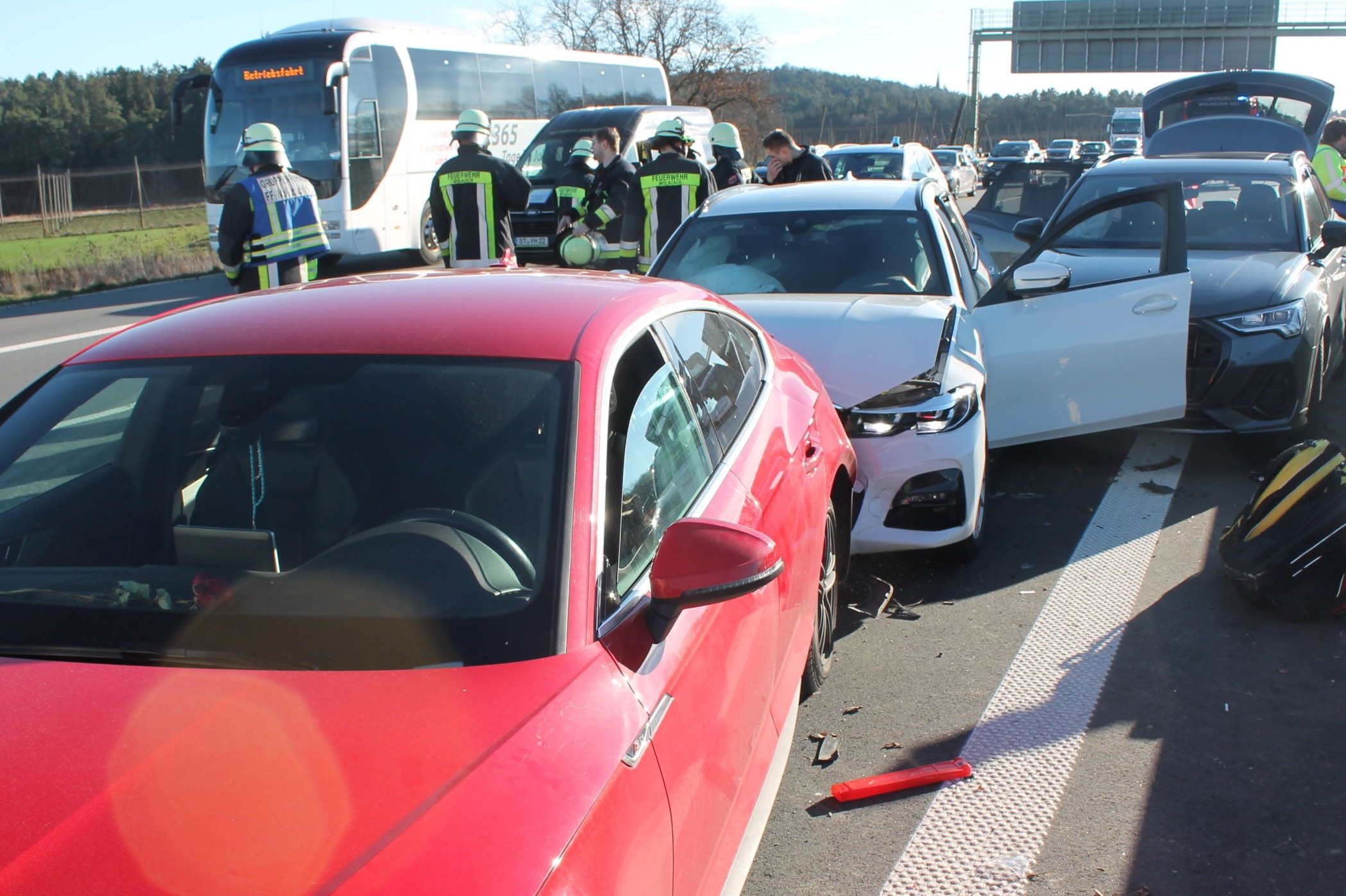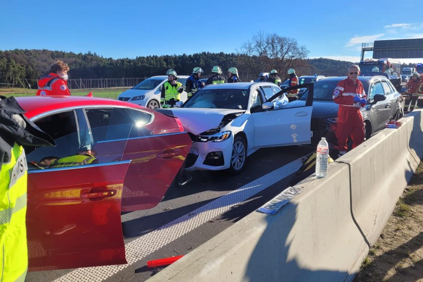 Jeweils leicht verletzt wurden demnach die 30-jährige Beifahrerin des Unfall-Verursachers, die 22-jährige Beifahrerin des Pkw aus Allersberg, die Lenker des Pkw aus Eichstätt sowie deren zwei Mitfahrerinnen im Alter von 25 und 22 Jahren. Der bei dem Unfall entstandene Sachschaden wurde von den Streifenbeamten auf insgesamt etwa 100 000 Euro beziffert. Die linke und die mittlere Spur seien für zirka vier Stunden wegen der Bergungs-Maßnahmen und der Reinigungs-Arbeiten gesperrt gewesen. Die genannten Feuerwehren waren mit insgesamt sechs Fahrzeugen und 35 Leuten im Einsatz. "Der Rückstau war aufgrund des Reiseverkehrs bis zu 15 Kilometer lang und dauerte bis in die frühen Abendstunden an", so ein Polizei-Sprecher.