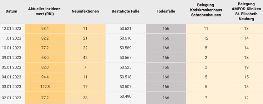 (ty) Im Kreis Neuburg-Schrobenhausen gibt es in Zusammenhang mit der Corona-Pandemie, wie berichtet, mittlerweile 166 Menschenleben zu beklagen. Die weitere Situation stellt sich laut aktuellen Angaben des Landratsamts wie folgt dar: Bislang – Stand: heute – wurden insgesamt 50 621 Infektionen mit dem Virus registriert. Das sind elf mehr als gestern gemeldet. Die Mitteilung von Zahlen zum Infektions-Geschehen in den einzelnen Gemeinden sowie zur Zahl der Genesenen sei nicht mehr möglich, hatte die Behörde erklärt. Wir fassen nachfolgend die Daten zusammen, die zur derzeitigen Corona-Lage im Landkreis vorliegen. Seit 3. April 2022 gelten massive Lockerungen der Corona-Regelungen in Bayern, seit 16. November 2022 entfällt die Isolations-Pflicht für Corona-Infizierte, seit 10. Dezember 2022 die Masken-Pflicht im ÖPNV (Details siehe unten).