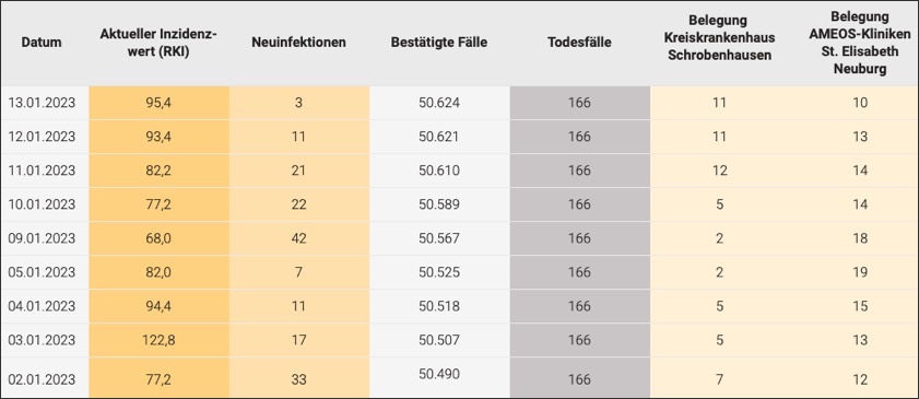 Der Wert der Sieben-Tage-Inzidenz – also die Zahl der registrierten Corona-Neuinfektionen binnen einer Woche pro 100 000 Einwohner – beträgt für den Kreis Neuburg-Schrobenhausen laut jüngsten Angaben des Robert-Koch-Instituts (RKI) 95,4 (Stand: heute). Zur Einordnung: Gestern hatte der Wert bei 93,4 gelegen, am Mittwoch bei 82,2, am Dienstag bei 77,2, am Montag bei 68,0 (siehe auch Tabelle unten). Dazu sollte man laut Landratsamt beachten: "Das Landesamt für Gesundheit und Lebensmittel-Sicherheit (LGL) übermittelt die Daten/Fallzahlen nicht mehr am Wochenende und an den Feiertagen an das RKI, sondern am folgenden Arbeitstag."