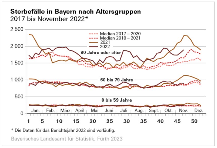 (ty) Wie das Expertenteam des bayerischen Landesamts für Statistik nach der Auswertung von vorläufigen Daten jetzt mitgeteilt hat, lag die Zahl der verstorbenen Menschen im Freistaat im November des vergangenen Jahres mit 12 447 Personen insgesamt auf ähnlichem Niveau wie der Median der Jahre 2018 bis 2021 (11 826 Verstorbene). Damit starben nach Angaben der Behörde im November 2022 deutlich weniger Personen als im November des Vorjahres (14 737). Allerdings: Die Gruppe der 80-Jährigen und Älteren verzeichnet im November 2022 im Vergleich zum Median der vier Vorjahre einen Anstieg der Sterbefall-Zahlen um 7,8 Prozent.