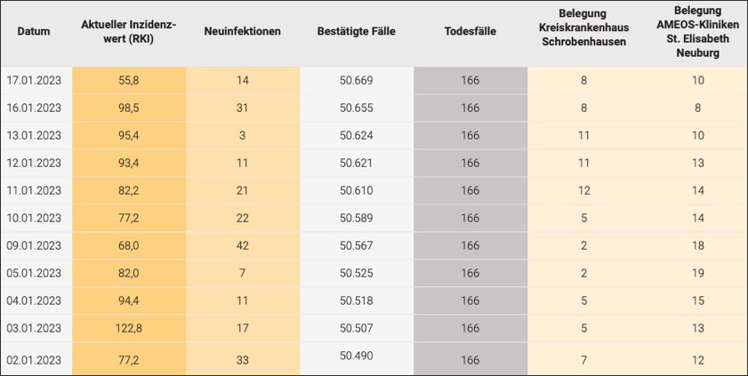 (ty) Im Kreis Neuburg-Schrobenhausen gibt es in Zusammenhang mit der Corona-Pandemie, wie berichtet, mittlerweile 166 Menschenleben zu beklagen. Die weitere Situation stellt sich laut aktuellen Angaben des Landratsamts wie folgt dar: Bislang – Stand: heute – wurden insgesamt 50 669 Infektionen mit dem Virus registriert. Das sind 14 mehr als gestern gemeldet. Die Mitteilung von Zahlen zum Infektions-Geschehen in den einzelnen Gemeinden sowie zur Zahl der Genesenen sei nicht mehr möglich, hatte die Behörde erklärt. Wir fassen nachfolgend die Daten zusammen, die zur derzeitigen Corona-Lage im Landkreis vorliegen. Seit 3. April 2022 gelten massive Lockerungen der Corona-Regelungen in Bayern, seit 16. November 2022 entfällt die Isolations-Pflicht für Corona-Infizierte, seit 10. Dezember 2022 die Masken-Pflicht im ÖPNV (Details siehe unten).
