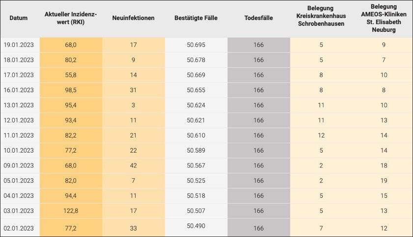 (ty) Im Kreis Neuburg-Schrobenhausen gibt es in Zusammenhang mit der Corona-Pandemie, wie berichtet, mittlerweile 166 Menschenleben zu beklagen. Die weitere Situation stellt sich laut aktuellen Angaben des Landratsamts wie folgt dar: Bislang – Stand: heute – wurden insgesamt 50 695 Infektionen mit dem Virus registriert. Das sind 17 mehr als für gestern gemeldet (Die gestrigen Zahl wurde von der Behörde nachträglich auf 50 678 korrigiert). Die Mitteilung von Zahlen zum Infektions-Geschehen in den einzelnen Gemeinden sowie zur Zahl der Genesenen sei nicht mehr möglich, hatte die Behörde erklärt. Wir fassen nachfolgend die Daten zusammen, die zur derzeitigen Corona-Lage im Landkreis vorliegen. Seit 3. April 2022 gelten massive Lockerungen der Corona-Regelungen in Bayern, seit 16. November 2022 entfällt die Isolations-Pflicht für Corona-Infizierte, seit 10. Dezember 2022 die Masken-Pflicht im ÖPNV (Details siehe unten).