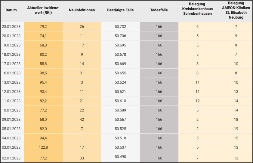 Der Wert der Sieben-Tage-Inzidenz – also die Zahl der registrierten Corona-Neuinfektionen binnen einer Woche pro 100 000 Einwohner – beträgt für den Kreis Neuburg-Schrobenhausen laut jüngsten Angaben des Robert-Koch-Instituts (RKI) 79,2 (Stand: heute). Zur Einordnung: Am Freitag hatte der Wert bei 74,1 gelegen, am Donnerstag bei 68,0, am Mittwoch bei 80,2, am Dienstag bei 55,8, am vergangenen Montag bei 98,5 (siehe auch Tabelle unten). Dazu sollte man laut Landratsamt beachten: "Das Landesamt für Gesundheit und Lebensmittel-Sicherheit (LGL) übermittelt die Daten/Fallzahlen nicht mehr am Wochenende und an den Feiertagen an das RKI, sondern am folgenden Arbeitstag."