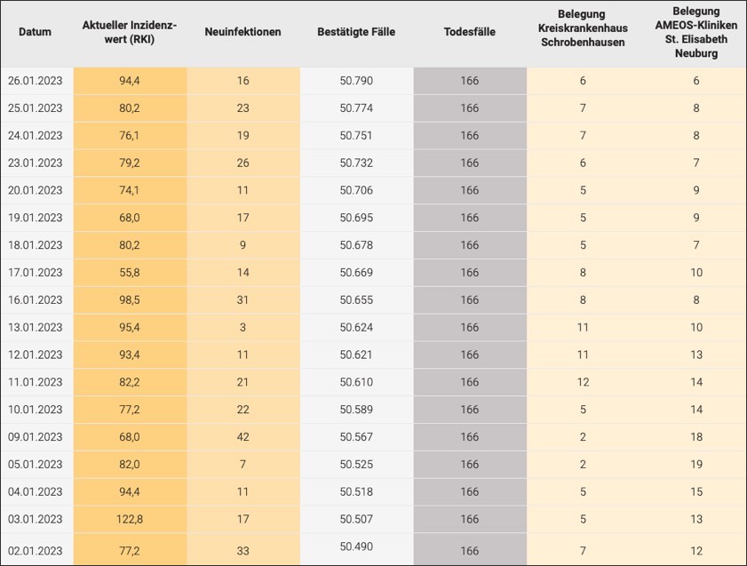 (ty) Im Kreis Neuburg-Schrobenhausen gibt es in Zusammenhang mit der Corona-Pandemie, wie berichtet, mittlerweile 166 Menschenleben zu beklagen. Die weitere Situation stellt sich laut aktuellen Angaben des Landratsamts wie folgt dar: Bislang – Stand: heute – wurden insgesamt 50 790 Infektionen mit dem Virus registriert. Das sind 16 mehr als gestern gemeldet. Die Mitteilung von Zahlen zum Infektions-Geschehen in den einzelnen Gemeinden sowie zur Zahl der Genesenen sei nicht mehr möglich, hatte die Behörde erklärt. Wir fassen nachfolgend die Daten zusammen, die zur derzeitigen Corona-Lage im Landkreis vorliegen. Seit 3. April 2022 gelten massive Lockerungen der Corona-Regelungen in Bayern, seit 16. November 2022 entfällt die Isolations-Pflicht für Corona-Infizierte, seit 10. Dezember 2022 die Masken-Pflicht im ÖPNV (Details siehe unten).