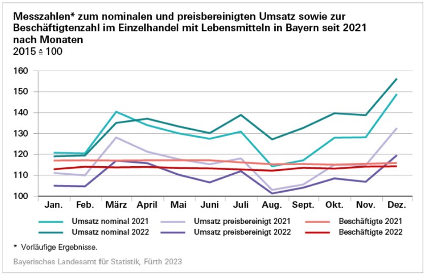 Im Dezember vergangenen Jahres wuchs der nominale Umsatz des Einzelhandels gegenüber dem Dezember 2021 um 0,2 Prozent, während der preisbereinigte Umsatz um 9,2 Prozent sank. Die Zahl der Beschäftigten verringerte sich um 0,4 Prozent. Gegenüber dem November 2022 stieg der nominale Umsatz des Einzelhandels in Bayern im Dezember um 1,9 Prozent. Der Umsatz im "Einzelhandel mit Lebensmitteln" wuchs um 12,6 Prozent, während der Umsatz im "Einzelhandel mit Nicht-Lebensmitteln" um 1,9 Prozent abnahm.