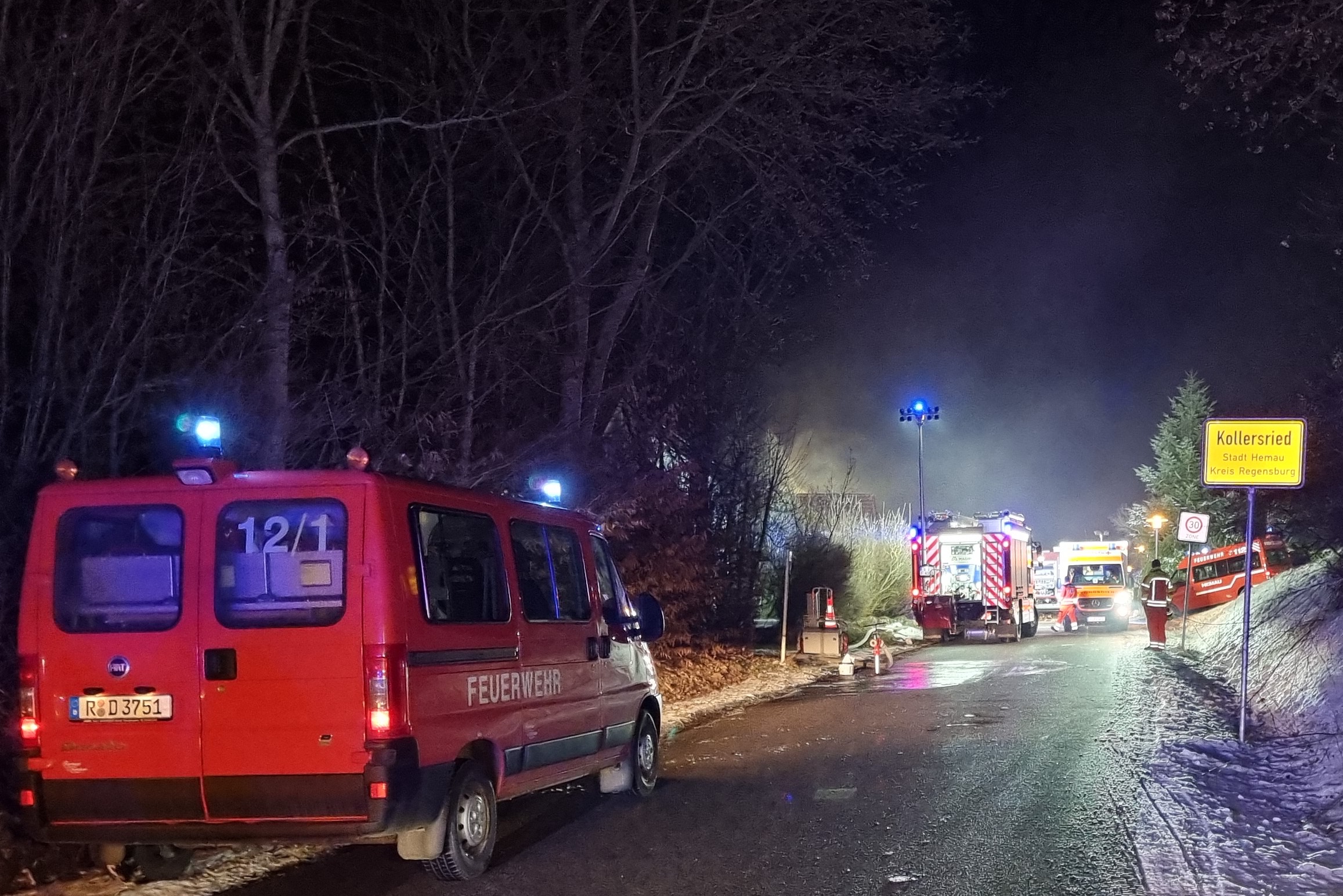(ty) Das Erdgeschoss und das Obergeschoss eines Einfamilienhauses in Kollersried, einem Ortsteil von Hemau (Landkreis Regensburg), sind am gestrigen Abend komplett ausgebrannt. Der 56 Jahre alte Bewohner des Gebäudes musste, unter anderem wegen einer Rauchvergiftung, in ein Krankenhaus gebracht werden. Über die genaue Höhe des Schadens, der durch das Feuer entstanden ist, ist noch nichts bekannt. Ebenso unklar ist nach Angaben der örtlich zuständigen Polizeiinspektion aus Nittendorf bislang die Ursache für das Unglück.