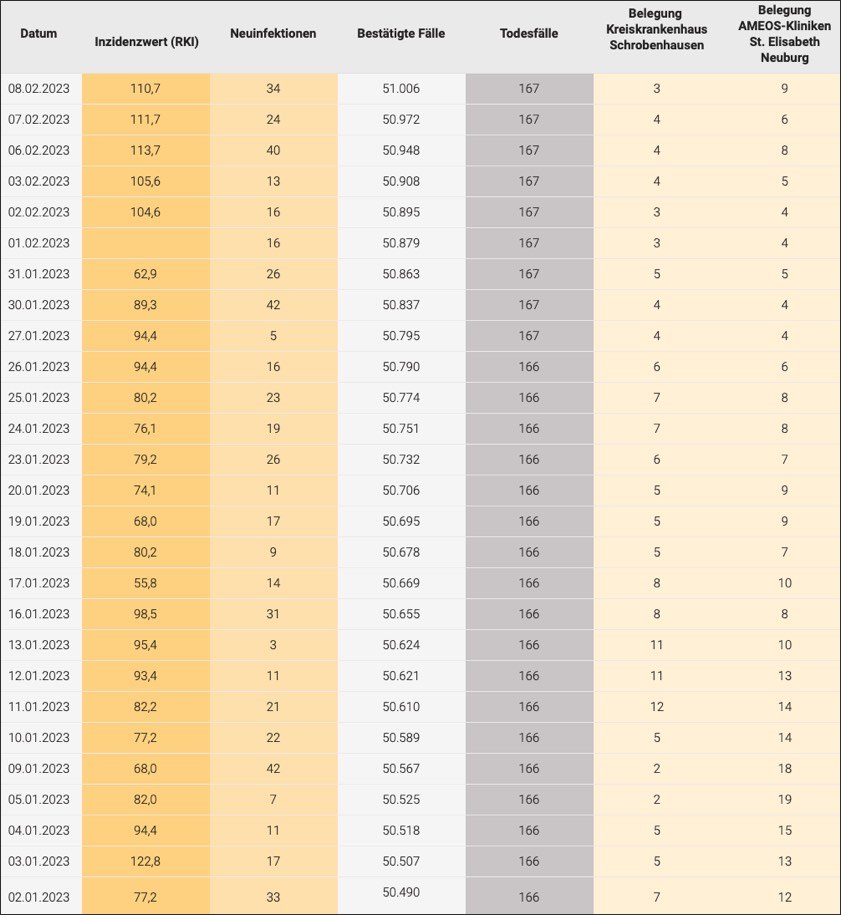 (ty) Im Kreis Neuburg-Schrobenhausen gibt es in Zusammenhang mit der Corona-Pandemie, wie berichtet, mittlerweile 167 Menschenleben zu beklagen. Die weitere Situation stellt sich laut aktuellen Angaben des Landratsamts wie folgt dar: Bislang – Stand: heute – wurden insgesamt 51 006 Infektionen mit dem Virus registriert. Das sind 34 mehr als gestern gemeldet. Die Mitteilung von Zahlen zum Infektions-Geschehen in den einzelnen Gemeinden sowie zur Zahl der Genesenen sei nicht mehr möglich, hatte die Behörde erklärt. Wir fassen nachfolgend die Daten zusammen, die zur derzeitigen Corona-Lage im Landkreis vorliegen. Seit 3. April 2022 gelten massive Lockerungen der Corona-Regelungen in Bayern, seit 16. November 2022 entfällt die Isolations-Pflicht für Corona-Infizierte, seit 10. Dezember 2022 die Masken-Pflicht im ÖPNV, seit Februar 2023 greifen weitere Erleichterungen (Details siehe unten).