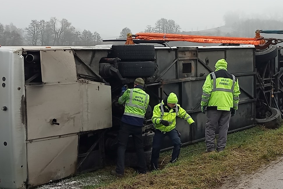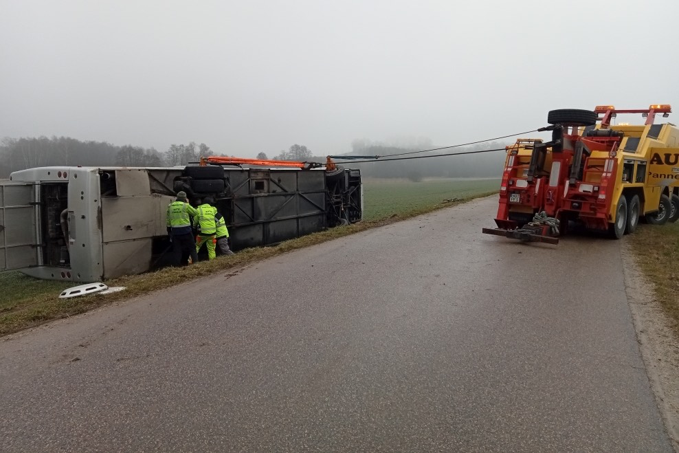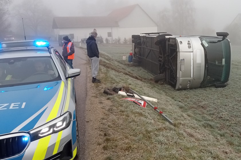Laut Polizei wegen Eisglätte kam der Bus im Gemeinde-Bereich von Kirchdorf von der Straße ab und kippte dann um.