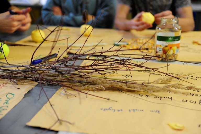 Auf großen Papierbögen geben die jungen Männer Persönliches wieder: Sie schreiben von den Auswirkungen des Arrestaufenthalts, ihren Erfahrungen mit dem Glauben, ihren Träumen nach der Haft. Danach reden sie in der großen Gruppe darüber. „Die Jungs sollen dadurch sehen, wie andere Menschen funktionieren, sollen Impulse kriegen, wie sie ihr Leben weiter gestalten können, Orientierung bekommen für das Leben draußen“, sagt Dennis Nuygen. Auch während des Bastelns der Schrumpfköpfe gehen die Gespräche weiter, es entstehen Diskussionen und immer wieder werfen auch Dennis und Monty neue Fragen auf, kommentieren, schlichten wenn nötig und erinnern an Pflichten, die jeder in der Gesellschaft doch auch tragen müsse.
