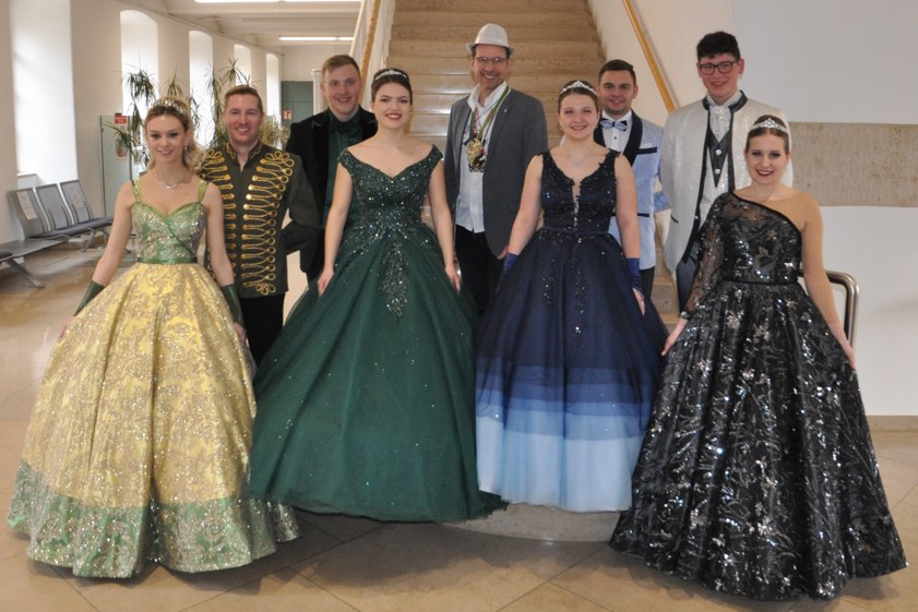 (ty) Am so genannten Rußigen Freitag wird der große Sitzungs-Saal des Landratsamts in Neuburg an der Donau traditionell zur Bühne für Faschings-Garden aus dem Kreis Neuburg-Schrobenhausen. Landrat Peter von der Grün hieß heute die "Burgfunken" aus Neuburg, die "Schromlachia" aus Schrobenhausen, "Fidelitas 85" aus Rennertshofen, die Faschingsgarde aus Bertoldsheim, "Euphoria" aus Weidorf sowie "Hot & Crazy" aus Waidhofen willkommen. Auf dem Foto oben ist der Landkreis-Chef mit den Prinzen-Paaren aus Schrobenhausen, Neuburg, Bertoldsheim und Rennertshofen zu sehen.