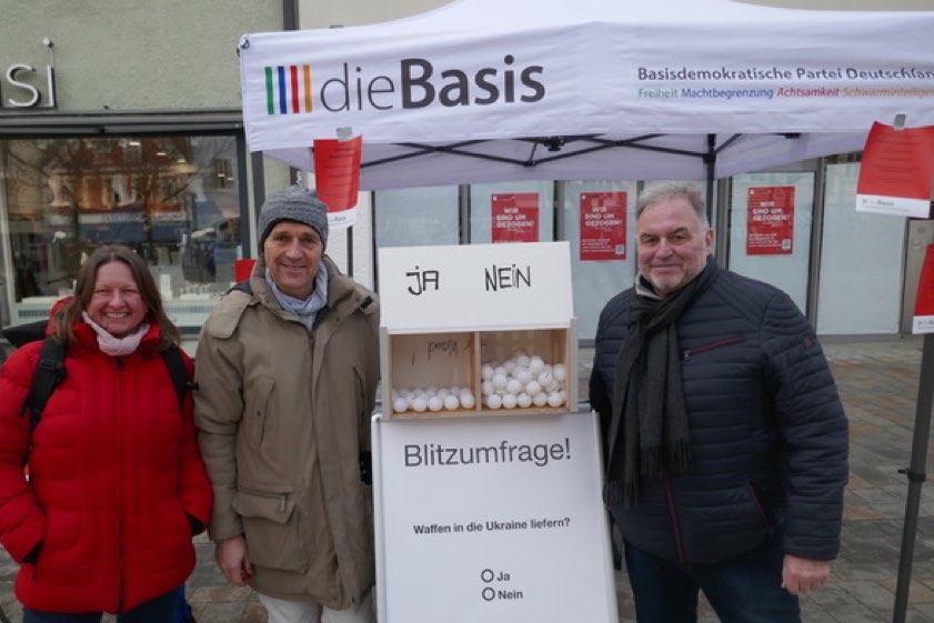 (ty) Der hiesige Kreisverband der Partei "Die Basis" ist am Samstag, 11. Februar, mit einem Info-Stand am Wochenmarkt in Pfaffenhofen vertreten gewesen. Dabei sei es schwerpunktmäßig um "Krieg und Frieden" gegangen, wie jetzt mitgeteilt wurde. Zum ersten Mal habe man eine Blitz-Umfrage durchgeführt. Wie es heißt, konnten interessierte Erwachsene zu der Frage "Waffen in die Ukraine liefern?" ihre Meinung durch den entsprechenden Einwurf eines Tischtennisballs in eine Box kundtun. Der Inhalt der beiden Bereiche dieser Box sei während der laufenden Abstimmung nicht einsehbar gewesen.