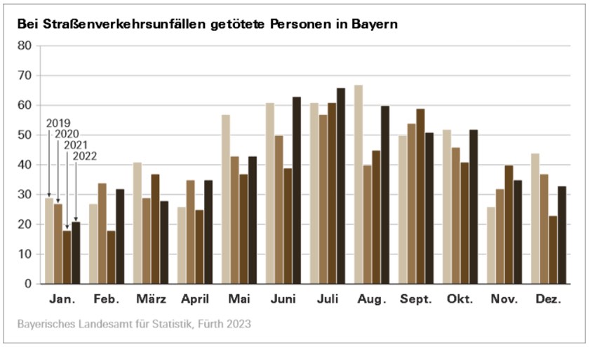 Im vergangenen Jahr wurden laut bayerischem Landesamt für Statistik in Bayern außerdem 61 781 Personen (plus 9,0 Prozent) bei Verkehrsunfällen verletzt; davon 9785 schwer (minus 0,2 Prozent). In allen sieben Regierungsbezirken waren im Jahr 2022 mehr Verunglückte im Straßenverkehr als im Vorjahr zu beklagen. Den stärksten prozentualen Anstieg verzeichnete Oberfranken (plus 13,5 Prozent), den geringsten die Oberpfalz (plus 5,9 Prozent). Die Zahl der im Straßenverkehr ums Leben gekommenen Personen erhöhte sich in fünf von sieben Regierungsbezirken merklich.
