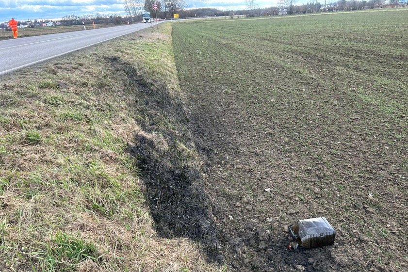 "So wie sich die Situation am Ereignisort darstellte, dürfte das Fahrzeug in Richtung Lenting unterwegs gewesen sein", heißt es in einer heute veröffentlichten Presse-Mitteilung der Wasserschutzpolizei. Kurz vor den Aussiedlerhöfen – mit Bushaltestelle – sei der besagte Kanister nach links aus dem Fahrzeug geworfen worden. "Der Kanister schlug am Rand der Böschung des Flurstücks mit der Flurnummer 614 auf und platze dabei. Anschließend verteilte sich der Inhalt über eine Länge von zirka 25 Metern bis hinunter zum angrenzenden Feld." Die Polizei-Fotos dokumentieren die Situation.