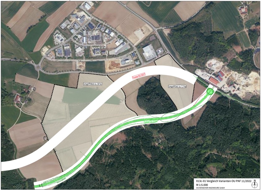 Das geplante neue Gewerbe- und Industrie-Gebiet, die ursprünglich geplante Umgehungsstraßen-Trasse (weiß) und die nun anvisierte Trasse (grün). (Grafik: Stadt Pfaffenhofen / Eichenseher-Ingenieure)