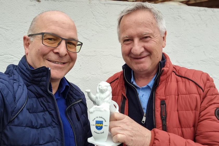 (ty) Im Namen der Fußball-Schiedsrichter-Gruppe von Pfaffenhofen hat deren Obmann Wolfgang Inderwies (Foto oben, links) seinem Kollegen Hans Hagl (rechts) zum 70. Geburtstag gratuliert und ihm als Präsent einen Porzellan-Löwen überreicht. Hagl ist als Sport-Funktionär weithin bekannt: Neben seinem Ehrenamt als Fußball-Referee ist er stellvertretender BLSV-Kreisvorsitzender und ehrenamtlicher Richter im Bezirks-Jugend-Sportgericht III des bayerischen Fußball-Verbands. Hagl und Inderwies verbinden gemeinsame frühere Zeiten beim Ball-Club Uttenhofen (BCU); beide waren in dem Verein viele Jahre lang im Vorstands-Gremium aktiv.