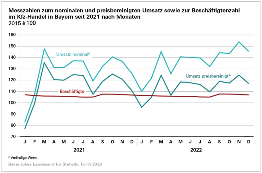 Im Dezember des vergangenen Jahres stieg der nominale Umsatz des Kfz-Handels in Bayern verglichen mit dem Dezember des Vorjahres um 15,6 Prozent. Der reale Umsatz wuchs lediglich um 5,7 Prozent. Gegenüber dem November 2022 sank der nominale Umsatz des Kfz-Handels in Bayern im Dezember 2022 um 5,4 Prozent.