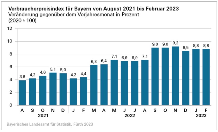 Die Inflationsrate, gemessen als prozentuale Veränderung des Verbraucherpreis-Index für Bayern gegenüber dem entsprechenden Vorjahres-Monat, lag also im Februar heuer bei 8,8 Prozent. Der Gesamt-Index ohne die aktuellen Haupt-Preistreiber Nahrungsmittel und Energie, in der öffentlichen Diskussion oft als Kerninflationsrate bezeichnet, belief sich im Februar auf 5,9 Prozent.