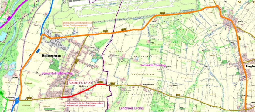 Während der kompletten Bauzeit – voraussichtlich ab dem kommenden Montag, 13. März, und bis Ende dieses Jahres – bleibe die FS12 im gesamten Baustellen-Bereich gesperrt. Der Verkehr werde großräumig umgeleitet. Der Anlieger-Verkehr sei jederzeit möglich, eine Durchfahrt jedoch nicht. Der von Erding her kommende Verkehr werde in Notzing auf die Kreisstraße ED5 nach Schwaig und von dort über die ED30 beziehungsweise FS11 in Richtung Hallbergmoos geleitet. Die Umleitung in der Gegenrichtung erfolge analog. Die Umleitung sei ausgeschildert. Der Umleitungs-Fahrplan für den MVV und die betroffenen Buslinien werde ausgehängt und sei zudem online auf www.mvv-muenchen.de abrufbar. (Karte: Landratsamt Freising)