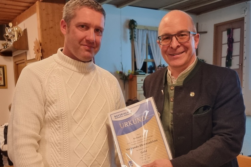 (ty) Im Rahmen der jüngsten Monats-Versammlung der Fußball-Schiedsrichter-Gruppe von Pfaffenhofen hat dessen Obmann Wolfgang Inderwies eine besondere Ehrung nachgeholt: Richard Ott vom SV Menning (Foto, links) erhielt für 30-jährige, aktive Schiedsrichter-Tätigkeit das BFV-Verbands-Ehrenzeichen in Gold. Ott war in den vergangenen Jahren als Fußball-Trainer beim TV Aiglsbach, beim TSV Abensberg, beim ATSV Kelheim sowie seinem Heimatverein, dem SV Menning, aktiv – und fand trotzdem immer noch Zeit, selbst als Unparteiischer auf dem Platz zu stehen