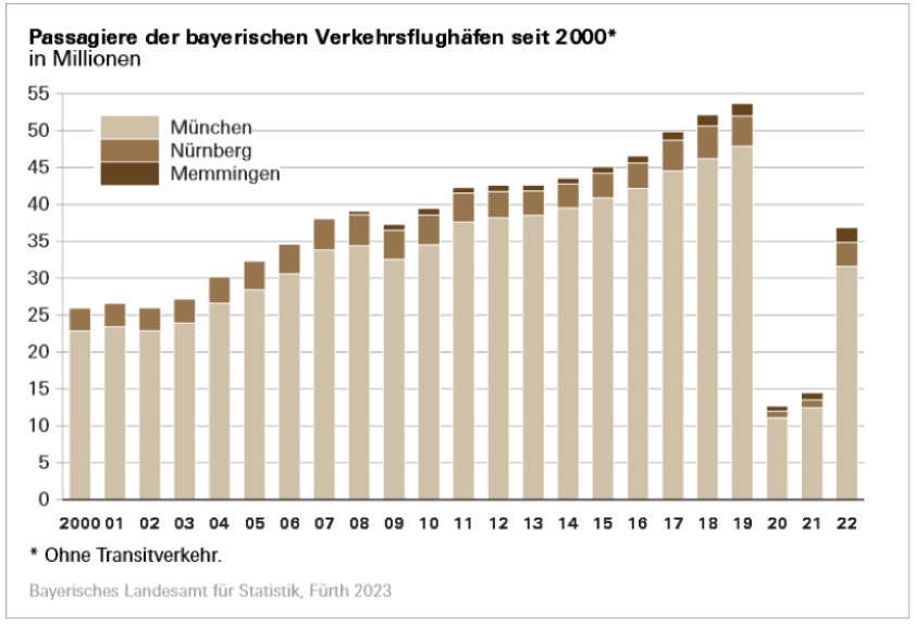 Memmingen verzeichnete mit knapp 1,99 Millionen fast ausschließlich Auslandsreisenden mehr als doppelt so viele Flugpassagiere wie im Jahr 2021. Damit lag Memmingen als einziger der drei bayerischen Hauptverkehrsflughäfen über dem Vor-Corona-Niveau aus dem Jahr 2019 – konkret um 15,7 Prozent. Der jüngste bayerische Flughafen meldete insgesamt 15 804 Starts und Landungen und damit 49,9 Prozent mehr als im Vorjahr.