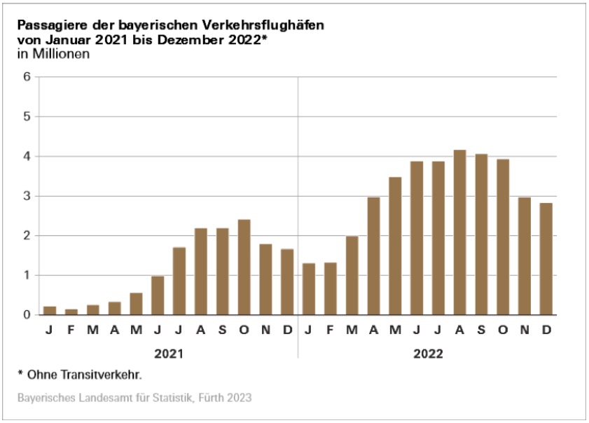 (ty) Im vergangenen Jahr sind insgesamt 321 990 Flugzeuge auf den drei großen bayerischen Verkehrsflughäfen München, Nürnberg und Memmingen gestartet und gelandet. Das waren zusammengenommen 87,5 Prozent mehr als im Vorjahr. Wie das bayerische Landesamt für Statistik nach Erkenntnissen des statistischen Bundesamts jetzt weiter mitteilte, flogen insgesamt rund 36,9 Millionen Passagiere von diesen drei Flughäfen ab oder landen dort (einschließlich Durchgangsverkehr). Das waren 154,0 Prozent mehr als im Vorjahr. Dennoch lag dieser Wert noch immer rund 31,4 Prozent unter dem Vor-Corona-Niveau aus 2019. Das Fracht- und Postaufkommen stieg an den genannten Flughäfen insgesamt um 47,4 Prozent auf 279 486 Tonnen, wobei hiervon 98,3 Prozent dem Flughafen München zuzurechnen waren.