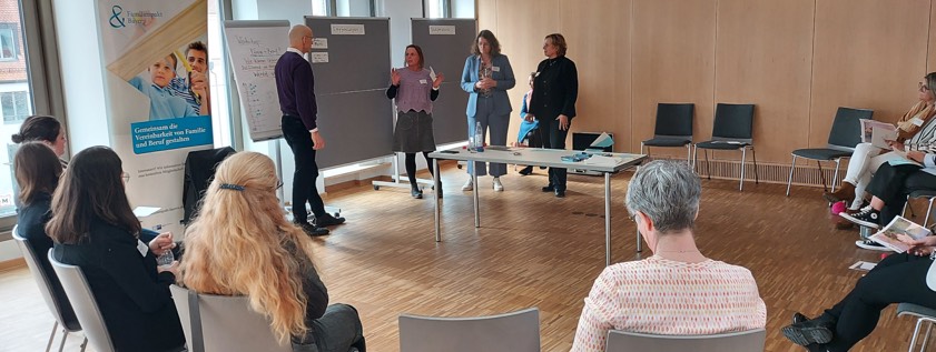 Zuvor hatten die Teilnehmer einen Überblick über die Einsatz-Möglichkeiten und Anknüpfungspunkte für betriebliches Familien-Bewusstsein im Unternehmen erhallten. Anne Seefeld von der Servicestelle des bayerischen Familien-Pakts betonte insbesondere die Faktoren Kommunikation, Unternehmenskultur und Werte sowie konkrete Personal-Maßnahmen, um Familienfreundlichkeit fest zu verankern. Ihre theoretischen Aussagen wurden durch regionale Unternehmens-Beispiele ergänzt.