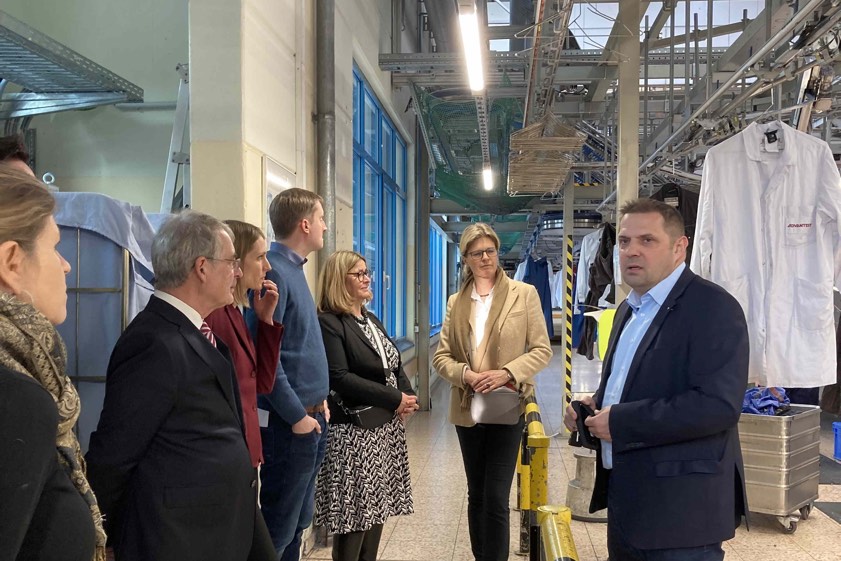 Steffen Kalus (rechts), Werkleiter von "Mewa" am Standort in Manching, gab den Mitgliedern des IHK-Regional-Ausschusses für den Landkreis Pfaffenhofen auch Einblicke in die Arbeit seines Unternehmens. Foto: IHK