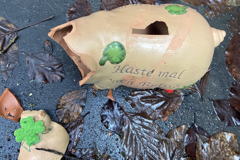 Apropos Trinkgeld-Kasse: In Neuburg/Donau ermittelt die Polizei – wie berichtet – derzeit wegen mehrerer Geld-Diebstähle, die in der City begangen wurden. In diesem Zusammenhang sei am Dienstag in der Franziskanerstraße unterhalb der Treppe zum Kräutergarten ein zerbrochenes Sparschwein entdeckt worden (Foto unten). Die Ermittler gehen davon aus, dass es geklaut und dann hier geleert worden ist. Bislang sei aber noch kein entsprechender Diebstahl angezeigt worden. Das Sparschwein aus Porzellan sei rosa-farben, mit grünen Kleeblättern und einem Marienkäfer versehen. Es trage die Aufschrift: "Haste mal nen Euro?" Wer Angaben zur Herkunft des Sparschweins machen oder sonstige Hinweise geben kann, möge sich unter der Rufnummer (0 84 31) 67 11 0 bei der Polizeiinspektion in Neuburg melden. (Foto: Polizeiinspektion Neuburg)