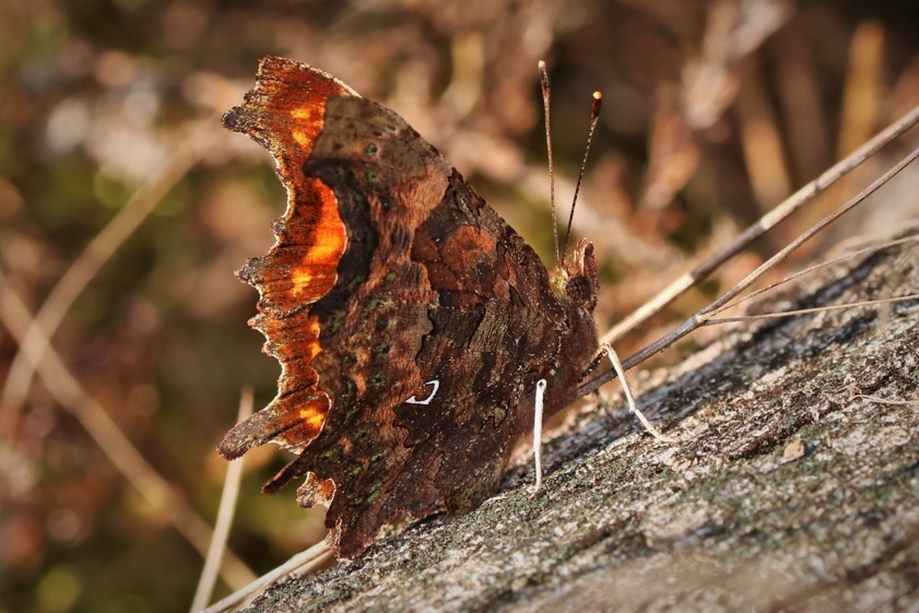 Ein C-Falter sonnt sich in den ersten warmen Frühlingstagen.