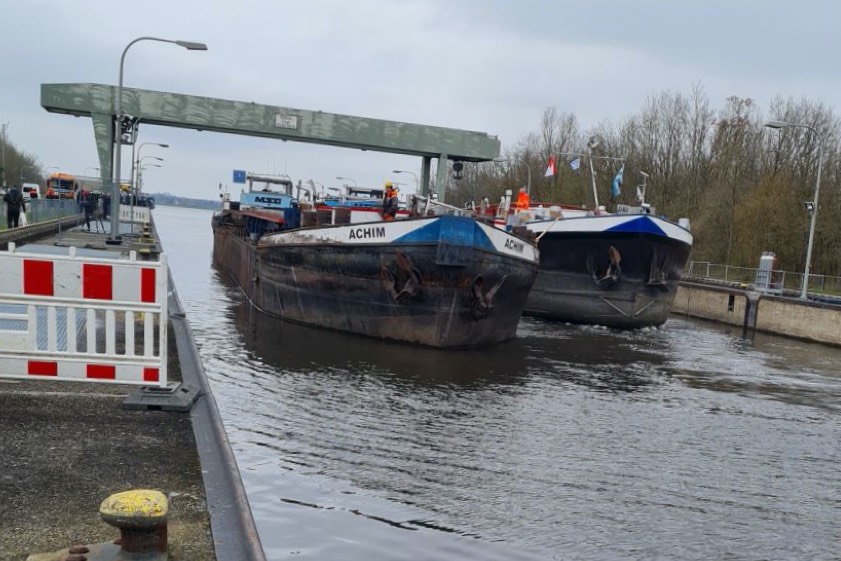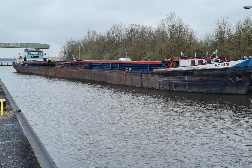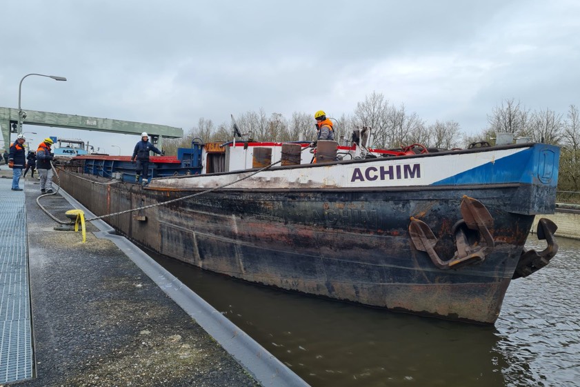 Bis zum gestrigen Morgen, so heißt es weiter, "mussten daraufhin am Havaristen weitere verstärkende Schweiß-Arbeiten durchgeführt werden". Da in das schwimmende Schiff über Nacht kein Wasser eingedrungen sei, habe am gestrigen Mittwoch um 10 Uhr die eigentliche Bergung des Schiffs aus der Schleusen-Kammer starten können. Hierzu sei die Schleusen-Kammer vorsichtig geflutet und das Schiff so "auf den Donau-Pegel flussaufwärts (Oberwasserstand) angehoben" worden. Eines der beiden Schiffe, die – wie berichtet – seit dem Untergang der "Achim" an jenem 10. März notgedrungen oberhalb der Schleuse von Geisling hatten festmachen müssen, weil die Unglücks-Schleuse gesperrt werden musste, leistete nun wertvolle Dienste.
