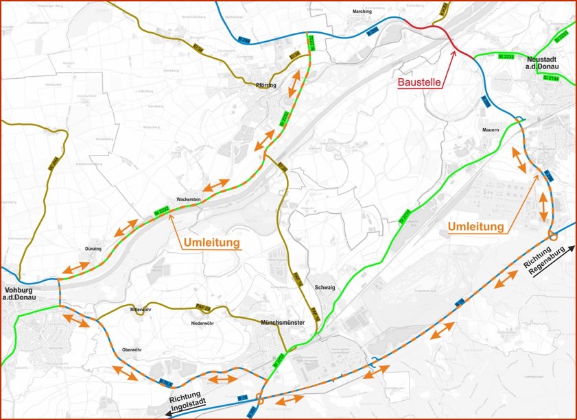 Für den überregionalen Verkehr und Fernverkehr werde eine großräumige Umleitung eingerichtet. Diese verlaufe von Neustadt/Donau über die Bundesstraße B16 nach Münchsmünster, von dort auf der B16a nach Vohburg und dann auf der Staatsstraße 2232 über Pförring nach Marching. Die Umleitung in der Gegenrichtung werde analog geführt. Um jedoch Anlieger-Verkehr zu ermöglichen, werde die Brücke nur halbseitig gesperrt, eine Ampel regle den Verkehr. "Wir appellieren eindringlich an den überregionalen Verkehr, im Sinne eines fairen Miteinanders nur die großräumige Umleitung zu nutzen", sagt Bayerstorfer: "Wir wissen um die Bedeutung der Donau-Brücke für die Region und sind bemüht, die Arbeiten so schnell wie möglich durchzuführen."
