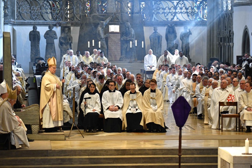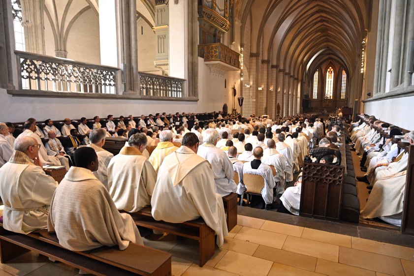 Zu Beginn seiner Predigt zeichnete Bischof Meier ein kirchliches Panorama, das eingerahmt ist von den Ergebnissen des Synodalen Wegs hierzulande und dem weltweiten synodalen Prozess, der mit dem Abschluss der kontinentalen Phase im Herbst in die Bischofs-Synode münden soll. "Was bei uns bleibt und was viele von uns umtreibt, ist die Kirchen-Kritik, die auf eine anschwellende Unzufriedenheit mit dem Zustand des Volkes Gottes – gerade in Deutschland – schließen lässt." Das zahlreiche Erscheinen in dieser krisenhaften Zeit sei nichts Selbstverständliches, begrüßte er die Priester und Diakone, die seiner Einladung gefolgt waren.