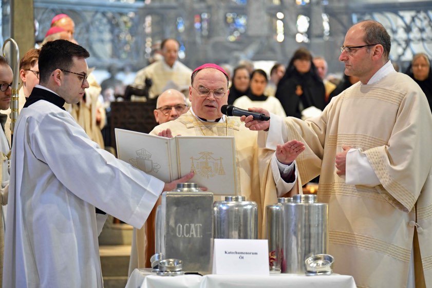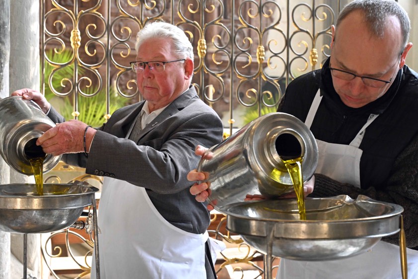 Auf die Predigt und die Erneuerung der Bereitschaft zum priesterlichen Dienst folgte die Weihe der heiligen Öle. In einer feierlichen Prozession wurden diese in großen Gefäßen in den Altarraum getragen: Das Katechumenenöl brachten Mitglieder des Ritterordens vom Heiligen Grab zu Jerusalem zum Altar, das Krankenöl brachten Mitarbeiterinnen und Mitarbeiter der Klinik-Seelsorge und das Chrisamöl wurde schließlich von zwei Ständigen Diakonen gebracht. Nach dem Gottesdienst wurden diese drei heiligen Öle, insgesamt waren es nach Angaben der Diözese 100 Liter, in kleinere Behälter abgefüllt und versiegelt sowie an Frauen und Männer aus den einzelnen Dekanaten verteilt.