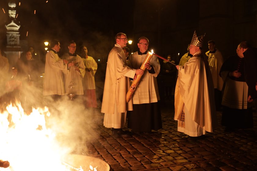 Am Freitag sei er abgetreten, am Sonntag früh wieder zurück: "Jesus ist wieder da! Anders da! Neu da!", freute sich Bischof Meier bereits am Samstagabend in seiner Predigt zur Osternacht. "Alles, aber auch wirklich alles, was unseren Glauben ausmacht, steht und fällt mit der Auferstehung", betonte er in dem von zahlreichen Kerzenlichtern erleuchteten Hohen Dom. Jesu Auferstehung sprenge alle Grenzen, verwandle Weihnachten von einem "orientalischen Märchen" zum Anfang des gewagtesten Kapitels der Menschheits-Geschichte und lasse Karfreitag keinen "bedauerlichen Justiz-Irrtum" sein, sondern mache ihn zu einem notwendigen Schritt hin zur Vollendung des göttlichen Plans: "Das Kreuz wird Siegeszeichen und Himmelsleiter", genauso wie die Kirche nur aufgrund der Auferstehung kein "Verein von Verrückten" sei, sondern ein "Volk für das Leben", wie Papst Johannes Paul II. es formuliert habe.