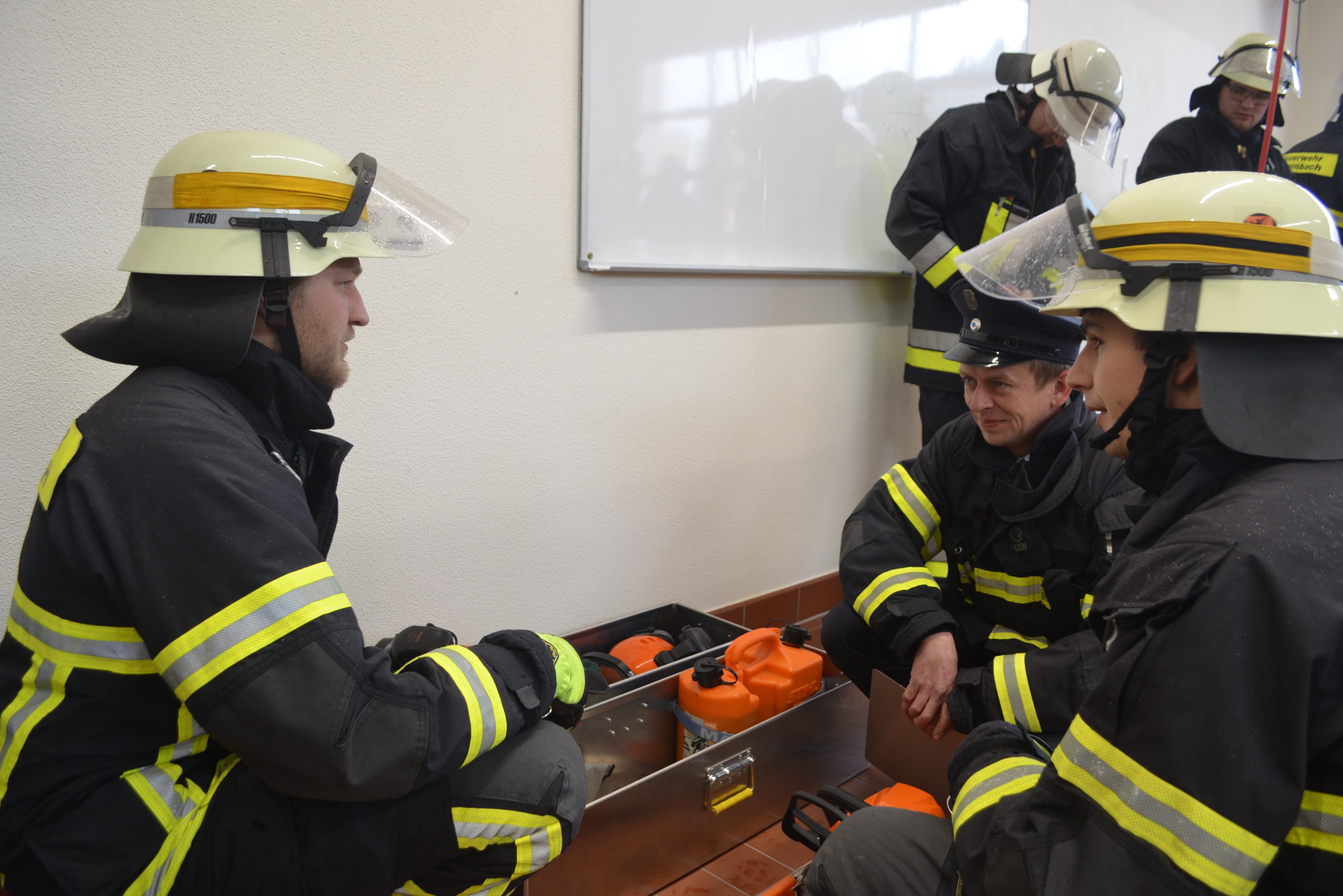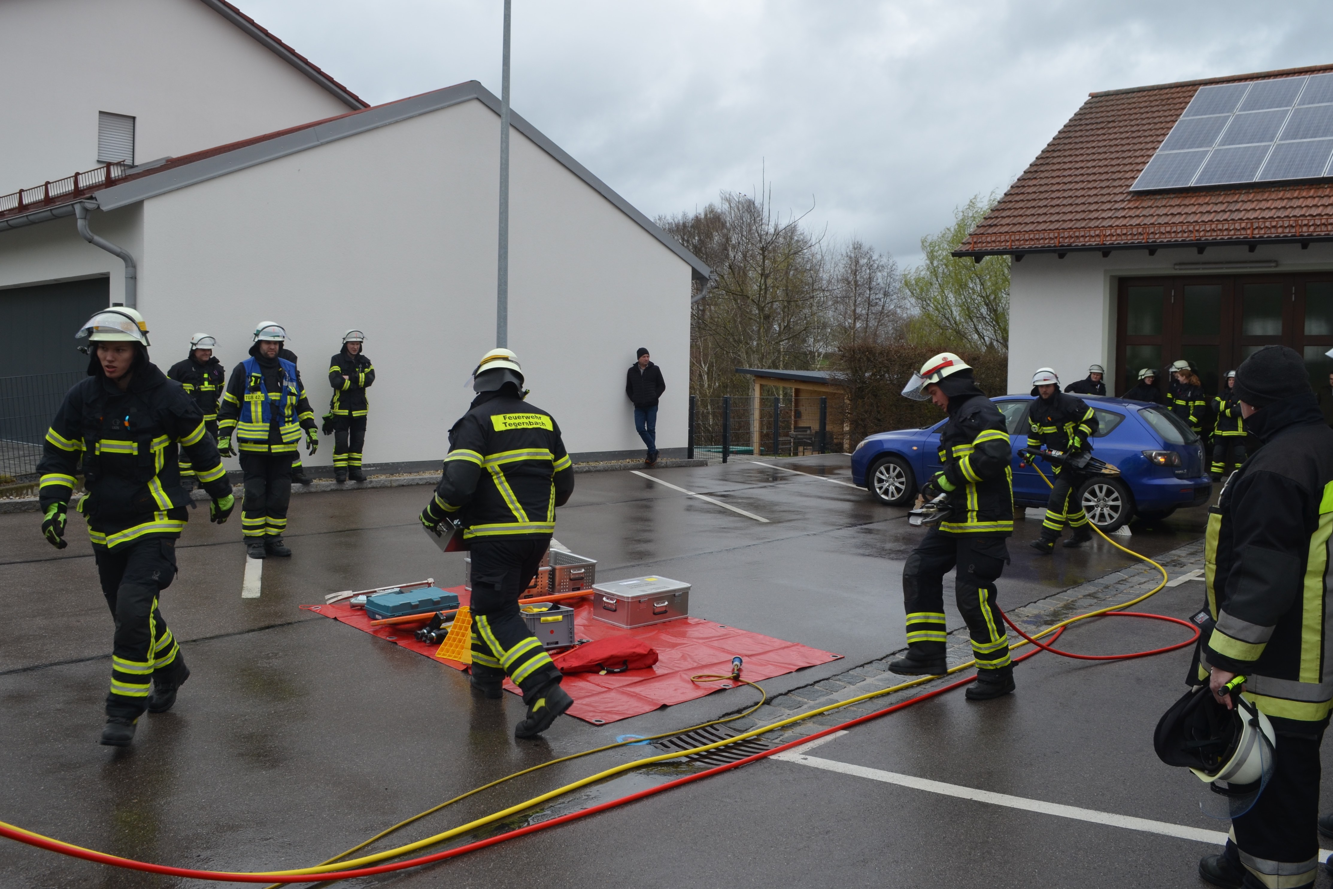 (ty) Vier Gruppen von Aktiven der Feuerwehr aus Tegernbach haben die Leistungs-Prüfung "Die Gruppe im Hilfeleistungs-Einsatz" mit Erfolg abgelegt (siehe auch Fotos unten). Dabei galt es, nach einem angenommenen Verkehrsunfall die eingeklemmte Person möglichst schnell zu befreien. Hierzu musste die Unglücksstelle zunächst abgesichert werden. Ferner galt es, alle benötigten Geräte auf einer Plane vorzubereiten, um diese bei Bedarf rasch griffbereit zu haben. Nachdem auch der Brandschutz mit Schnellangriffs-Einrichtung und Feuerlöscher sichergestellt war, konnte der Angriffs-Trupp mit Hilfe von Schere und Spreizer die Befreiung der verunglückten Person starten.