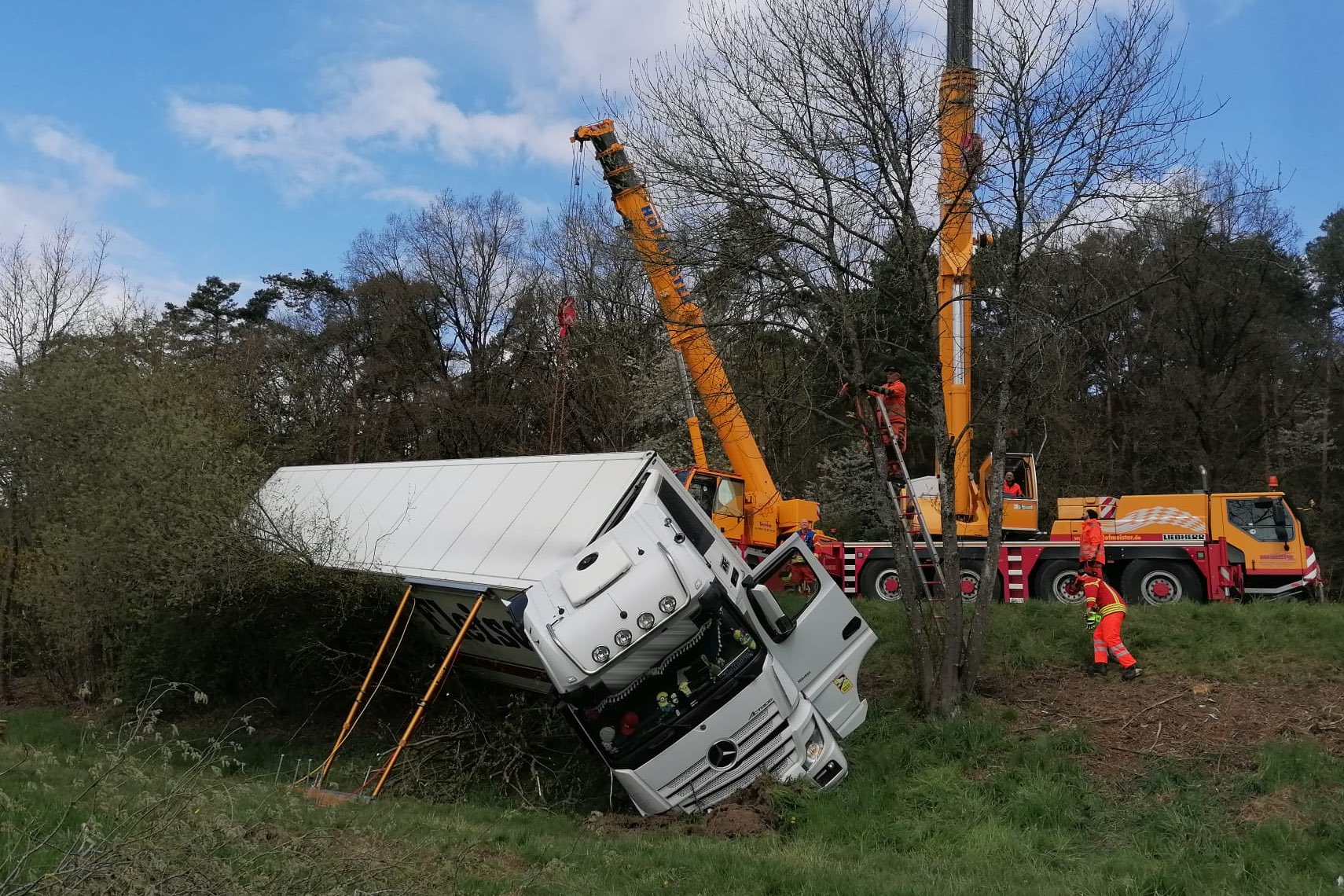 Sattelzug rutschte Böschung hinab, drohte vollends umzukippen. Fahrer unverletzt. Aufwändige Bergung mit Hilfe von Spezial-Kränen.
