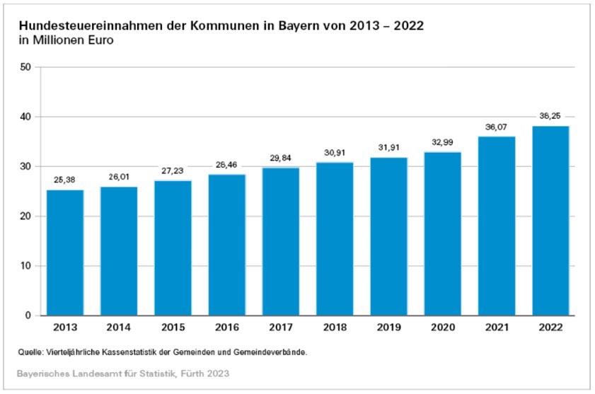 (ty) Nach den Ergebnissen aus der vom Landesamt für Statistik gepflegten, vierteljährlichen kommunalen Kassen-Statistik haben die bayerischen Städte und Gemeinden im vergangenen Jahr Hundesteuer in Höhe von 38,25 Millionen Euro eingenommen. Das sind 6,1 Prozent mehr als im Vorjahr, als 36,07 Millionen Euro einkassiert wurden. Damit erreichte das Hundesteuer-Aufkommen im Jahr 2022 einen neuen Höchstwert von 2,87 Euro pro Kopf.