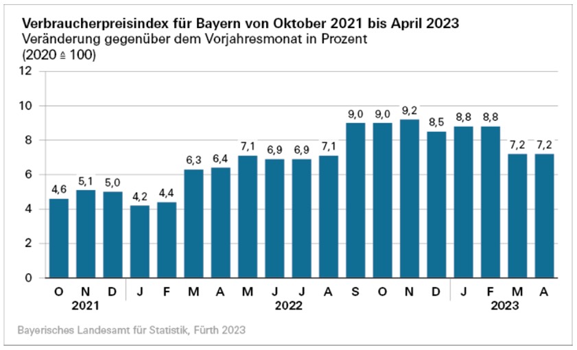 Die Inflationsrate, gemessen als prozentuale Veränderung des Verbraucherpreis-Index für Bayern gegenüber dem entsprechenden Vorjahres-Monat, liegt im April dieses Jahres bei 7,2 Prozent. Der Gesamt-Index ohne die aktuellen Haupt-Preistreiber Nahrungsmittel und Energie, in der öffentlichen Diskussion oft als Kerninflationsrate bezeichnet, beläuft sich im April – wie bereits im Monat zuvor – auf 5,9 Prozent. Gegenüber dem Vormonat stieg der Verbraucherpreis-Index im April um 0,4 Prozent.