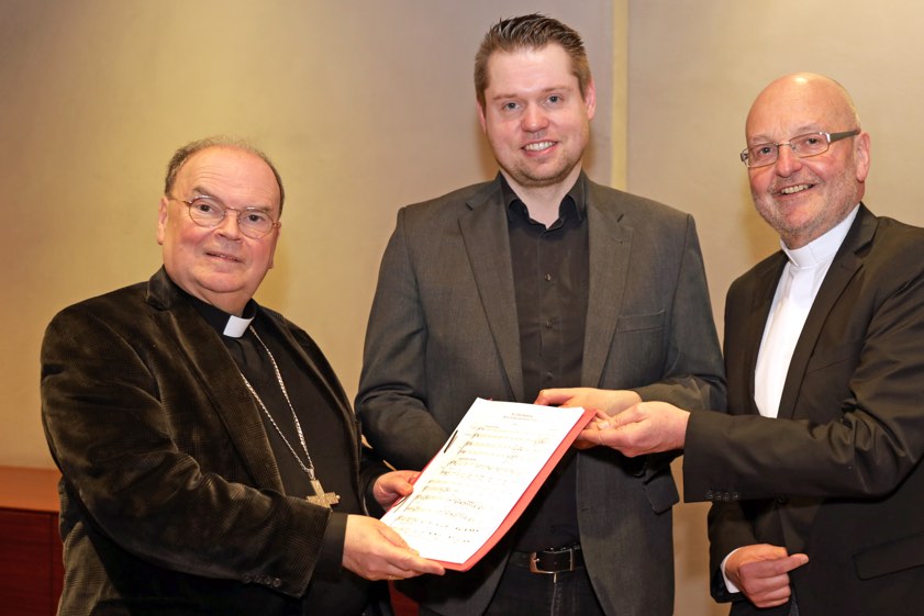 Bischof Bertram Meier (von links), Wettbewerbs-Sieger Jens Klimek und Stefan Kling von der Jury.