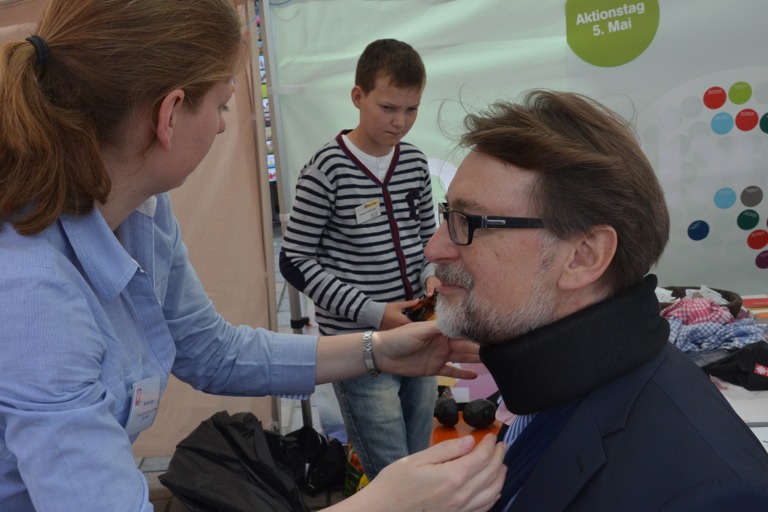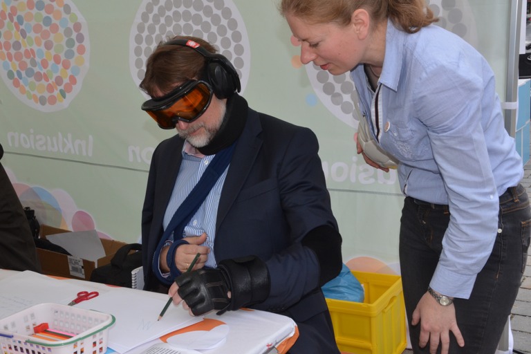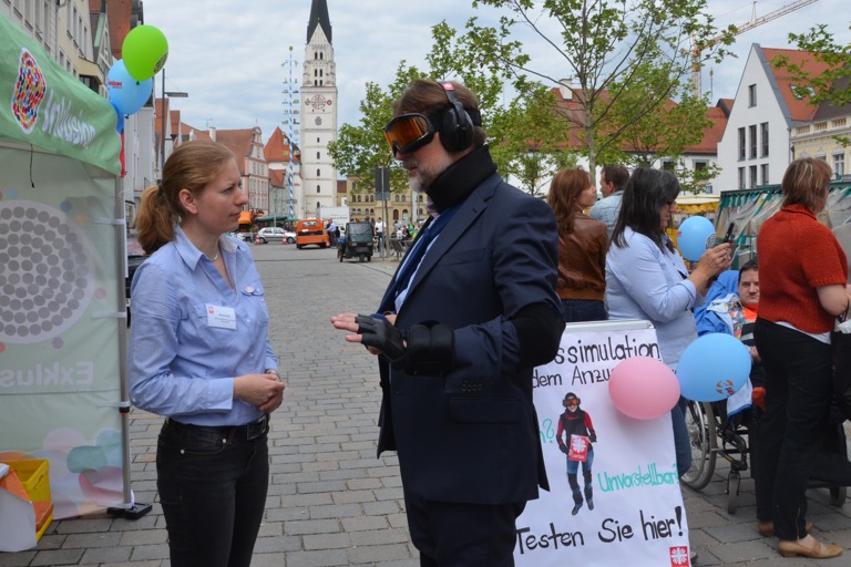 Der Altersanzug war nur ein Teil des Informationsangebots beim heutigen Aktionstag zur Gleichstellung von Menschen mit Behinderung, der von 9 bis 13 Uhr auf dem Pfaffenhofener Hauptplatz stattfand – unter dem Motto: „Schon viel erreicht. Noch viel mehr vor.“ Bei verschiedenen Aktionen hatten die Bürger Gelegenheit, sich mit der Frage zu beschäftigen: „Wie kann das gleichberechtigte Miteinander in allen Lebensbereichen gelingen?
