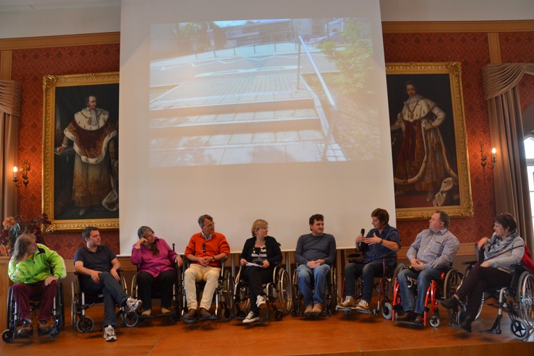 Berichteten von ihren Erlebnissen als Rollstuhlfahrer: Manfred "Mensch" Mayer (von links), Thomas Herker, Monika Schratt, Gunther Hasse, Simone Pfaller, Manfred Hegenauer, Brigitte Axthammer, Markus Käser, Elke Dürr. Im Hintergrund wurden aktuelle Fotos gezeigt, die die Problemstellen dokumentierten und veranschaulichten.