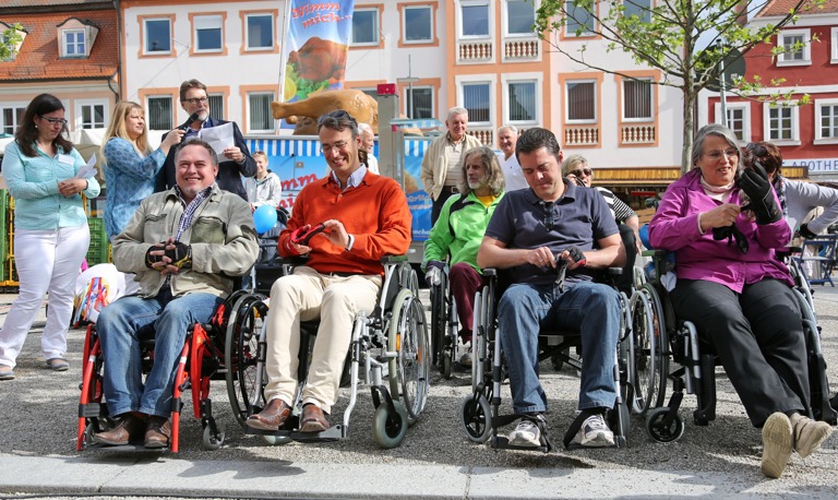 Im Rahmen des Aktionstags zum Thema Gleichstellung stiegen am heutigen Samstag, 12. Mai, acht Personen des öffentlichen Lebens freiwillig in einen Rollstuhl und erkundeten die Stadt aus dieser für sie ungewohnten Perspektive: Pfaffenhofens Bürgermeister Thomas Herker (SPD), SPD-Fraktionschef Markus Käser, die ehemalige Dritte Bürgermeisterin Monika Schratt (Grüne), Stadträtin Brigitte Axthammer (CSU), Stadtrat Manfred „Mensch“ Mayer (GfG), Kreisbaumeister Gunther-F.-L. Hasse und Susanne Pfaller vom Bayerischen Rundfunk sowie Elke Dürr, die Leiterin des Sachgebiets Familie, Jugend und Bildung am Landratsamt.