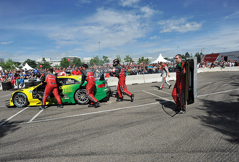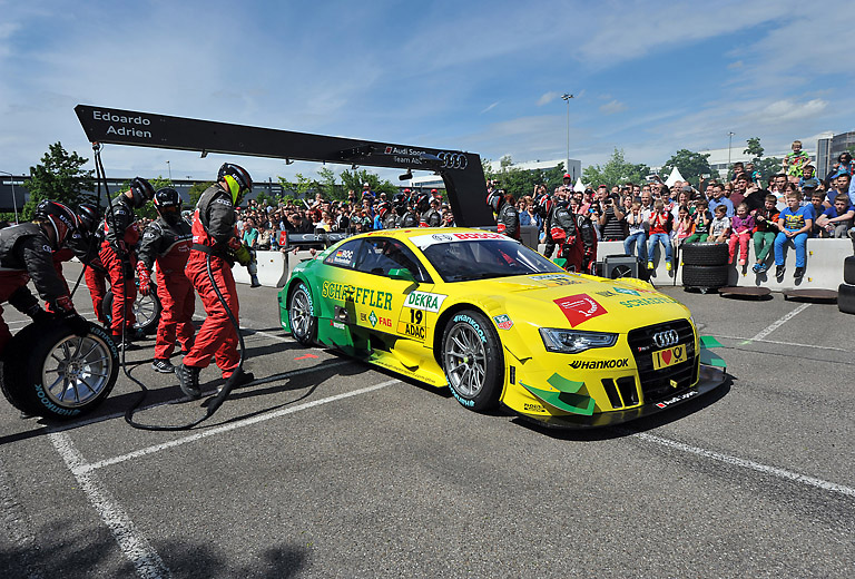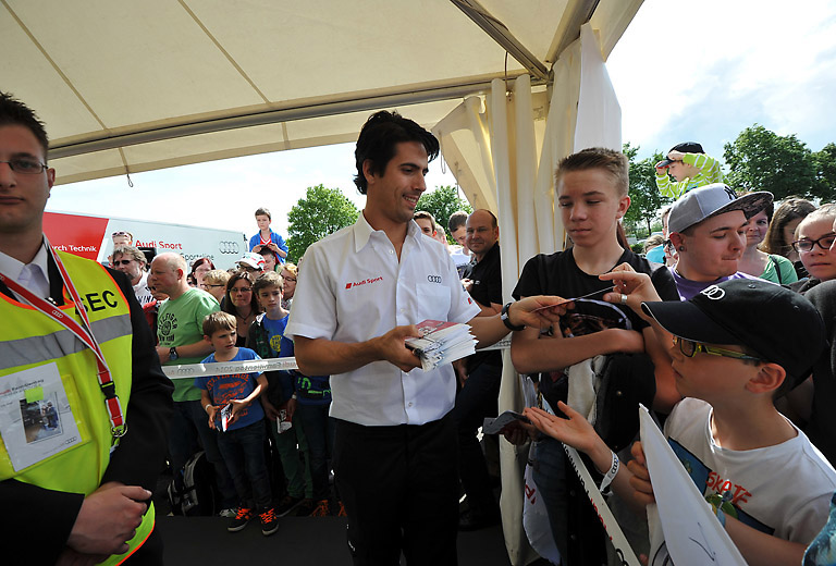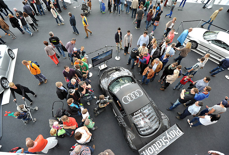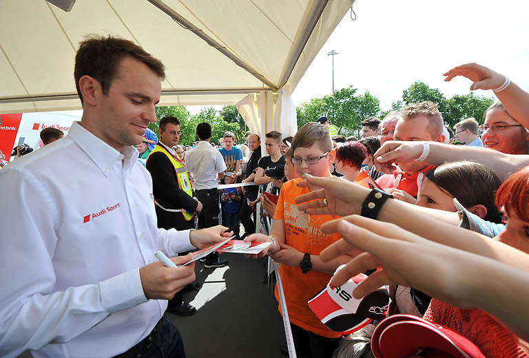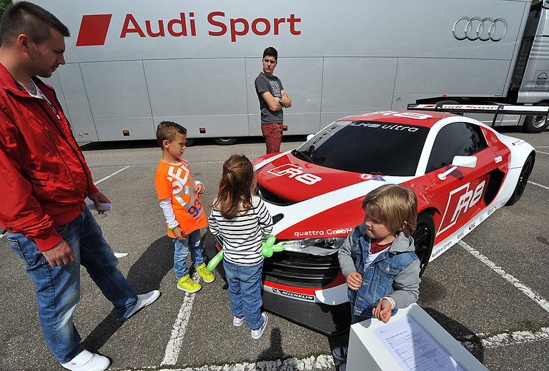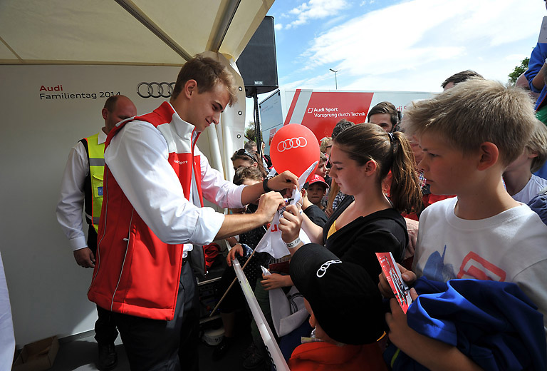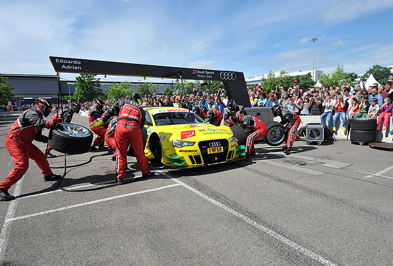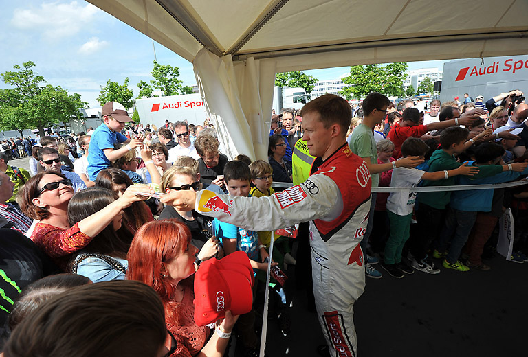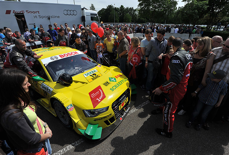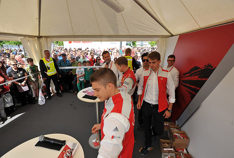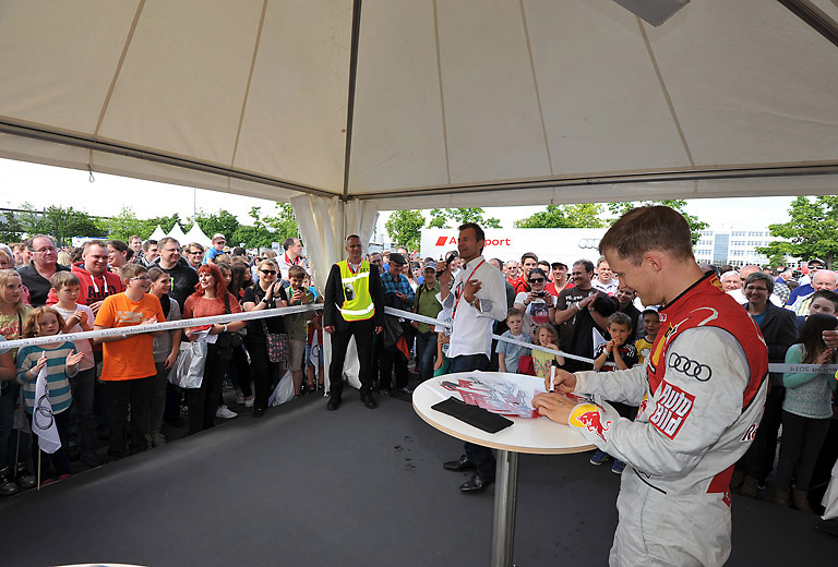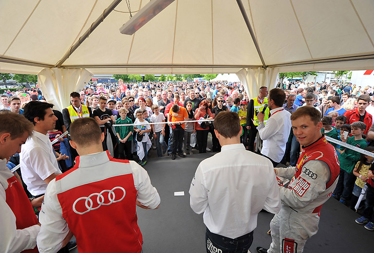 Audi Sport hatte auf dem Mitarbeiter-Parkplatz P11 ein Fahrerlager aufgebaut – mit vor Ort waren der originale Audi RS 5 DTM-Sieger, der WEC-Meister Audi R18 e-tron quattro und ein Audi R8 LMS ultra sowie drei Trucks. Für echte Rennatmosphäre sorgten die Demofahrten des DTM-Boliden. Fans konnten hier die erfolgreichen Audi-Rennfahrer live erleben und sich im Anschluss ein Autogramm holen.